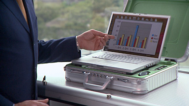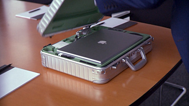 Durch kurzes Antippen fährt das Notebook nach oben und alle Schnittstellen und Laufwerke sind zugänglich. Die mögliche Schrägstellung der Tastatur erlaubt ergonomisches Arbeiten. Optional garantiert ein Spezial-Akku mit extra langer Laufleistung die mobile Stromversorgung. Eine angepasste Verkabelung aller Komponenten komplettiert das System.